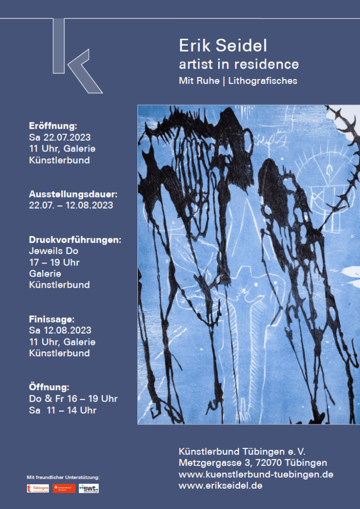 Der Künstlerbund Tübingen vergibt jährlich ein Stipendium zur Förderung der Druckgrafik. In diesem Jahr werde ich vom 15.07. bis zum 13.08. in der wunderschönen Druckwerkstatt in der Altstadt Tübingens arbeiten.