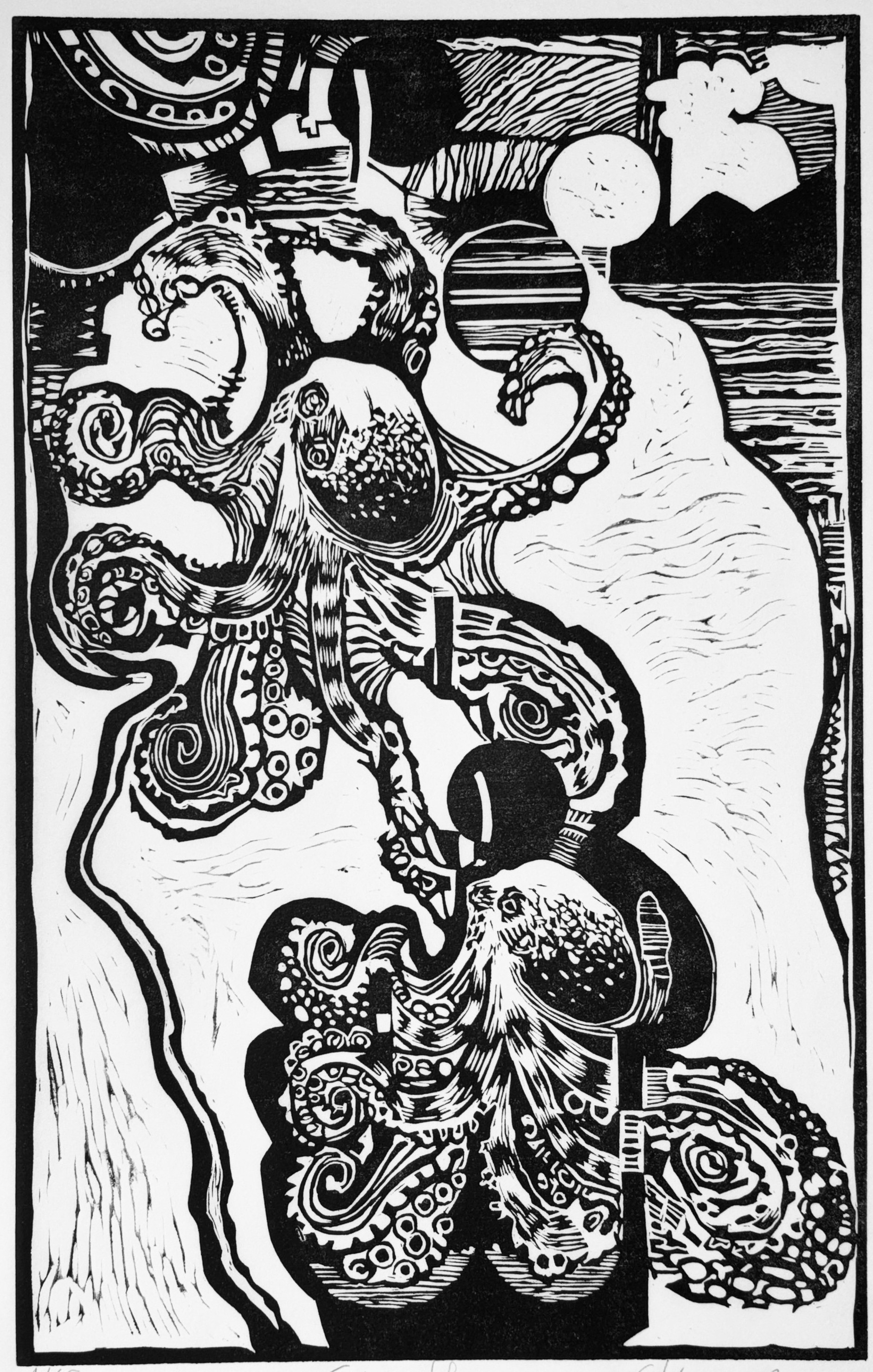 Christiane Werner, Oktopus, Linolschnitt